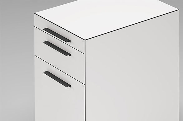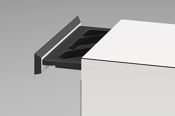 其独特的现代美学设计体现在45°斜切边的板件接缝,强调出柜体线条与设计感,黑色线条与白色面板完美结合,呈现出立体感十足的轮廓。精致的黑色窄边拉手与线条轮廓相得益彰,形成和谐统一的外观风格。