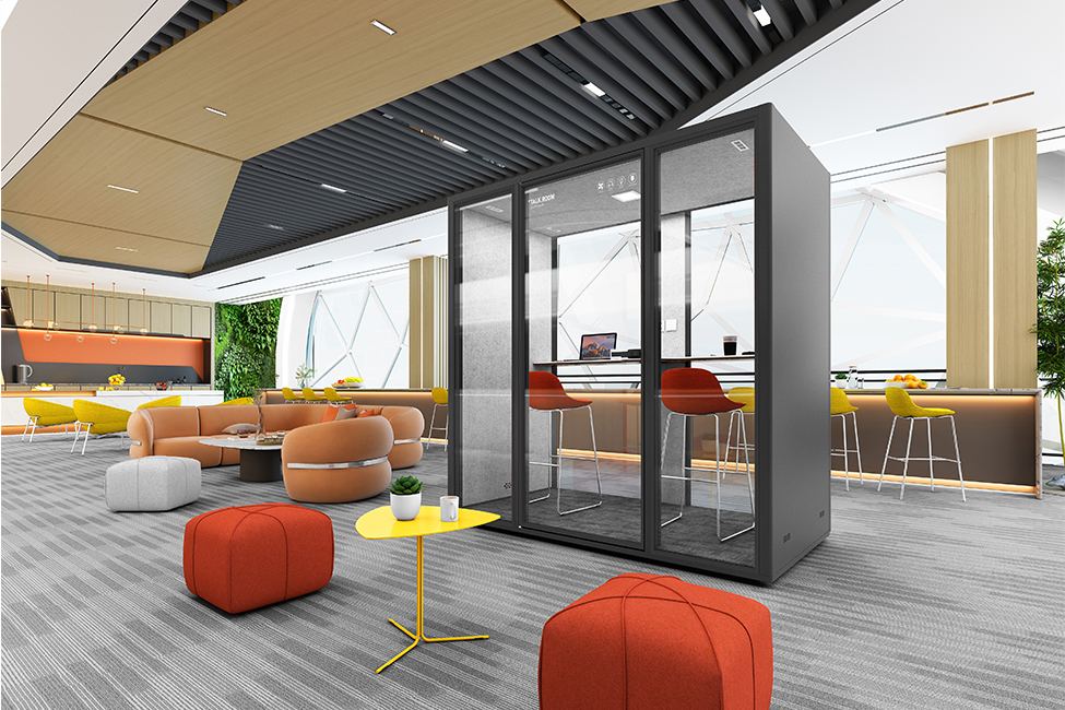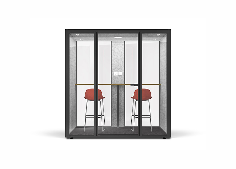 静音舱内部空间可以根据自己的喜好来选择适合的家具进行搭配设计,进一步提升空间的舒适性与自由度。面落地式隔音玻璃为舱内创造良好的天然采光条件,宽敞明亮的玻璃背板还可以增加设备带的应用,提供墙面电源插座,同时在视觉上可作为空间的分割装饰,满足功能性与美观性的巧妙平衡。